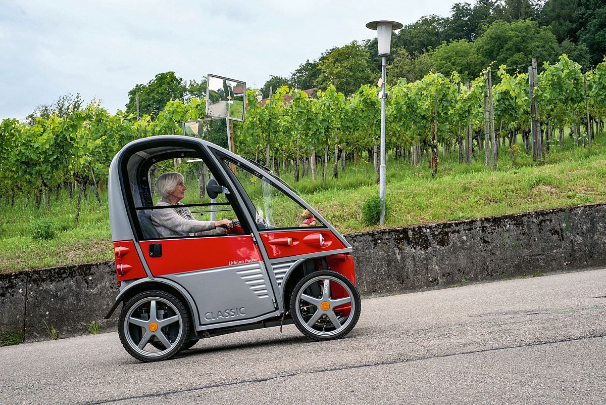 The KYBURZ PLUS electric scooter makes you independent! The four-wheeled vehicle with cab drives safely and reliably in any weather. Young people and elderly citizens alike drive the PLUS with enthusiasm.