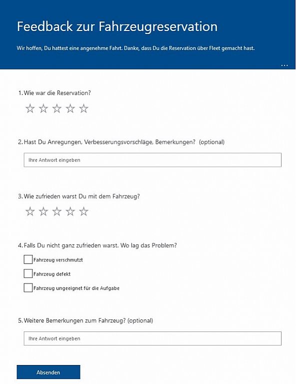 Since the end of March, you have received an e-mail with a link to a feedback form after completing your vehicle reservation in the fleet reservation tool. You can use this form to report back on your experiences with the reservation and the condition of the vehicle with little effort. The Fleet Team will evaluate your feedback and organise any improvements. Please take the time to fill in the form correctly. Thank you for your help.