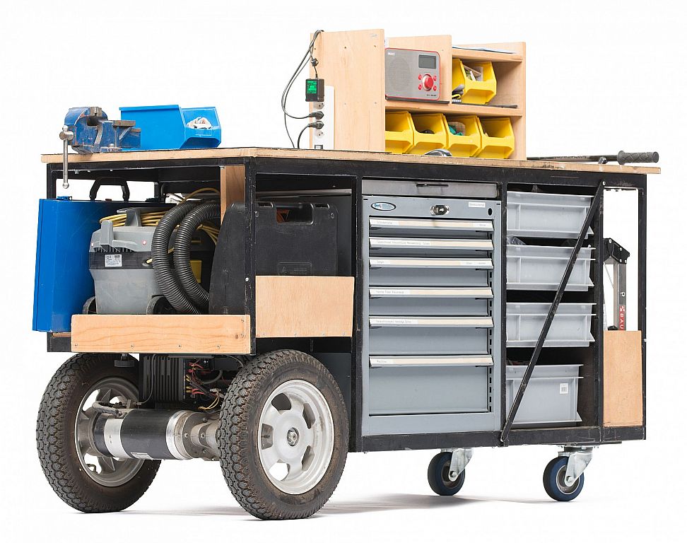 You probably know this mobile workbench. You have probably walked past it a thousand times or maybe you have already borrowed or deposited something. Exactly, this is Turi's faithful companion. It makes your day easier when it comes to maintaining the infrastructure, can be moved from one building to another easily and without any effort, and always has all the necessary tools on board.
