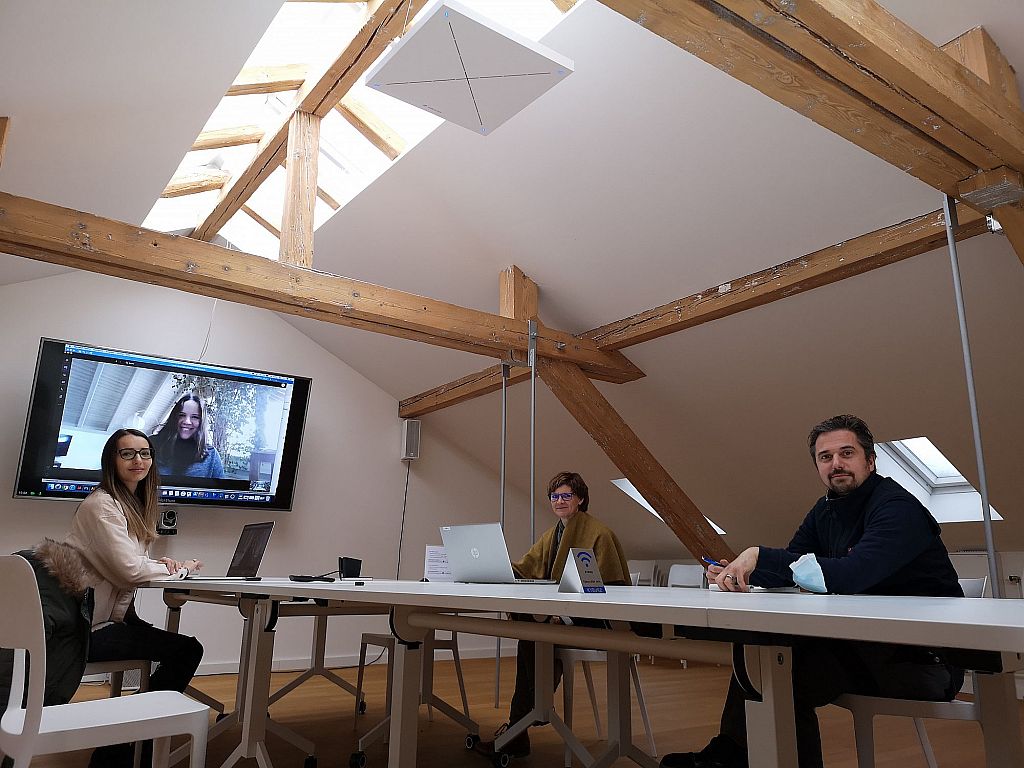 Last week the installation of the new videocall system in the attic took place. The same system was recently installed in our "discuss" meeting room and has already been tested several times. The Logitech and Sennheiser system has already proven itself in numerous meetings. The Sennheiser microphone enables clean and interference-free sound transmission.