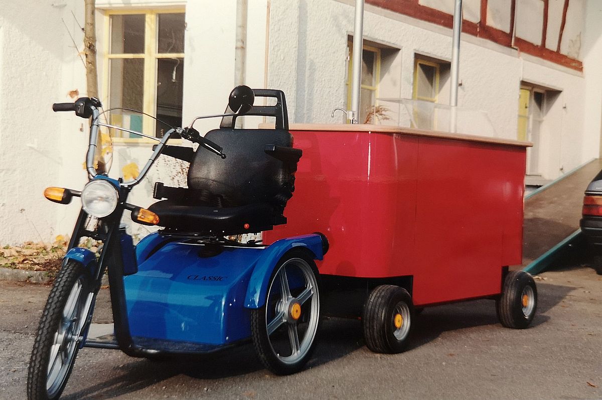Mes 15 voitures seniors construites étaient toujours là et nous avons donc décidé d'engager Markus Frey comme vendeur. Entre-temps, au printemps 1995 et nous nous sommes inscrits à une foire commerciale pour les personnes âgées. Comme prix de vente nous avons fixé CHF 9'900 pour notre véhicule senior. J'ai installé le stand. Une fois encore, j'ai dû utiliser le stand que j'avais déjà emprunté à mon ancien voisin au Salon de l'automobile de Genève. Je ne voulais pas être présent sur le stand. Je ne me considérais pas comme un vendeur et il y avait beaucoup à faire avec le Solar Eis.