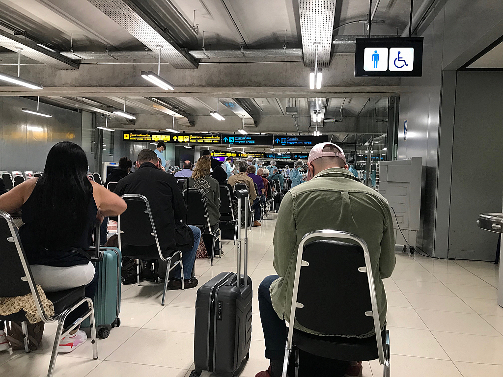 A l'arrivée à Bangkok, tout est très bien et très strict. Après avoir quitté l'avion, on devait s'assoir sur des chaises devant les postes de contrôle et attendre. Les documents ont ététcontrôlé à trois points de contrôle. Interdiction de se déplacer seul. Un personnel de l'aéroport en tenue de protection complète se trouvait toujours à proximité. Avec le taxi organisé par l'hôtel, qui était également "décoré" dans le style Covid, nous nous sommes rendus à l'hôtel.
