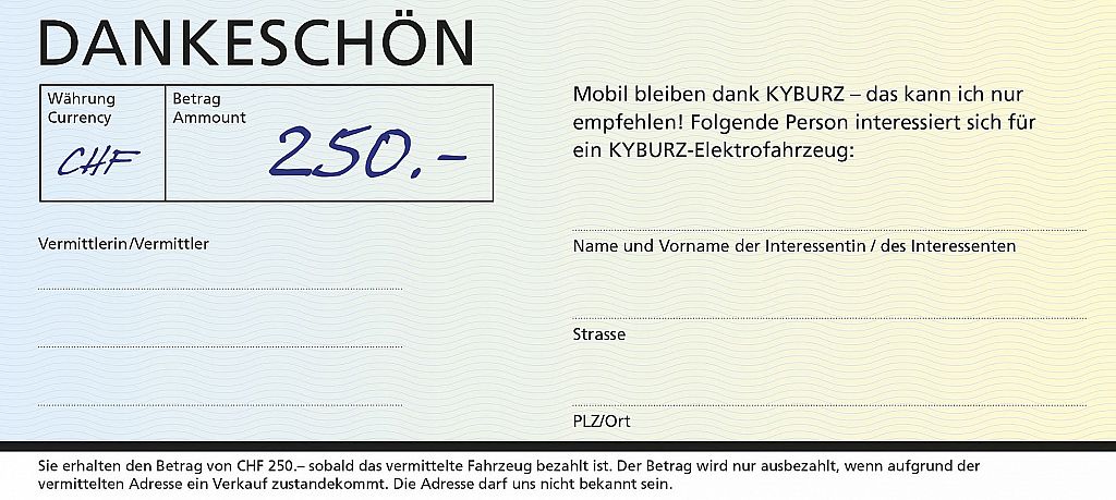 Nos clients aiment certainement raconter à leurs voisins, à leurs connaissances ou à leurs proches la nouvelle indépendance et la mobilité qu'ils ont gagnées grâce à leur véhicule KYBURZ. Alors pourquoi ne pas gagner 250 CHF supplémentaires en même temps ? Lors de l'achat d'un véhicule, chaque client peut nous indiquer un éventuel client potentiel avec le talon joint en nous le renvoyant. Si la partie intéressée n'est pas encore connue de KYBURZ et qu'une vente aboutit, l'intermédiaire est récompensé par une somme de 250 CHF. Voici la façon la plus facile de gagner 250 CHF !