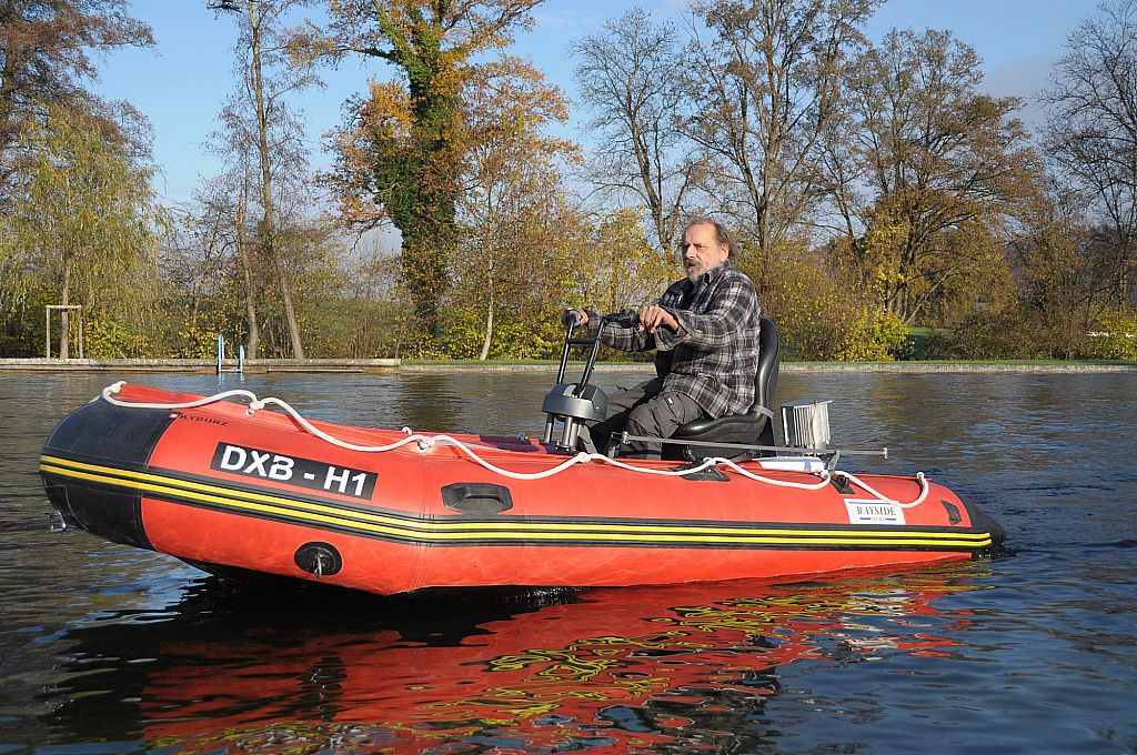 L'idée de la DXB H1 est venue de Heinz Romer. Il a investi de nombreuses heures au cours des dernières semaines dans la mise en œuvre. Le moment était enfin venu : le bateau pouvait être mis à l'eau et testé. L'équipe de six personnes a profité de la journée ensoleillée pour faire le premier test sur le bassin naturel de wakeboard du parc du Lieni. Et avec plein de succès ! Pour un hors-bord, 9 km/h à une vitesse de 4'300 n'est pas suffisant, mais le trajet confortable avec un café est couvert.