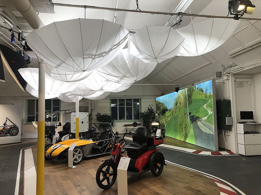 Vous l'avez sûrement déjà remarqué : dans notre salle d'exposition, le ciel est plein de parapluies. Ce qui permet d'éloigner la pluie du support dans la zone extérieure, nous aide dans la salle d'exposition à répartir la lumière de manière uniforme sur les objets exposés. De plus, tous nos véhicules, qui sont dans la salle d'exposition, ont été mis sous le bon éclairage. Le vélo sur mesure d'Ali est maintenant encore plus impressionnant.