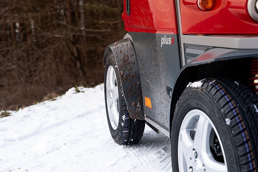 Nach vielen Jahren der Entwicklung steht er endlich da für meine erste Probefahrt: Der erste PLUS II. Ich habe mir für die Testfahrt einen wirklich harten Wintertag ausgesucht. Hier muss der PLUS II zeigen, was er kann. Von aussen fallen die sehr viel breiteren Räder auf. Die modernen Reifen haben viel weniger Rollwiderstand. Wir konnten bei der Neuentwicklung von Motorradreifen auf Autoreifen wechseln. Beim Öffnen der Türe fällt sofort auf, dass diese viel robuster geworden ist. Die massiven Scharniere ermöglichen mir ein sehr einfaches Einsteigen. Das Armaturenbrett haben wir komplett überarbeitet. Ein moderner Bildschirm zeigt mir alle notwendigen Informationen.