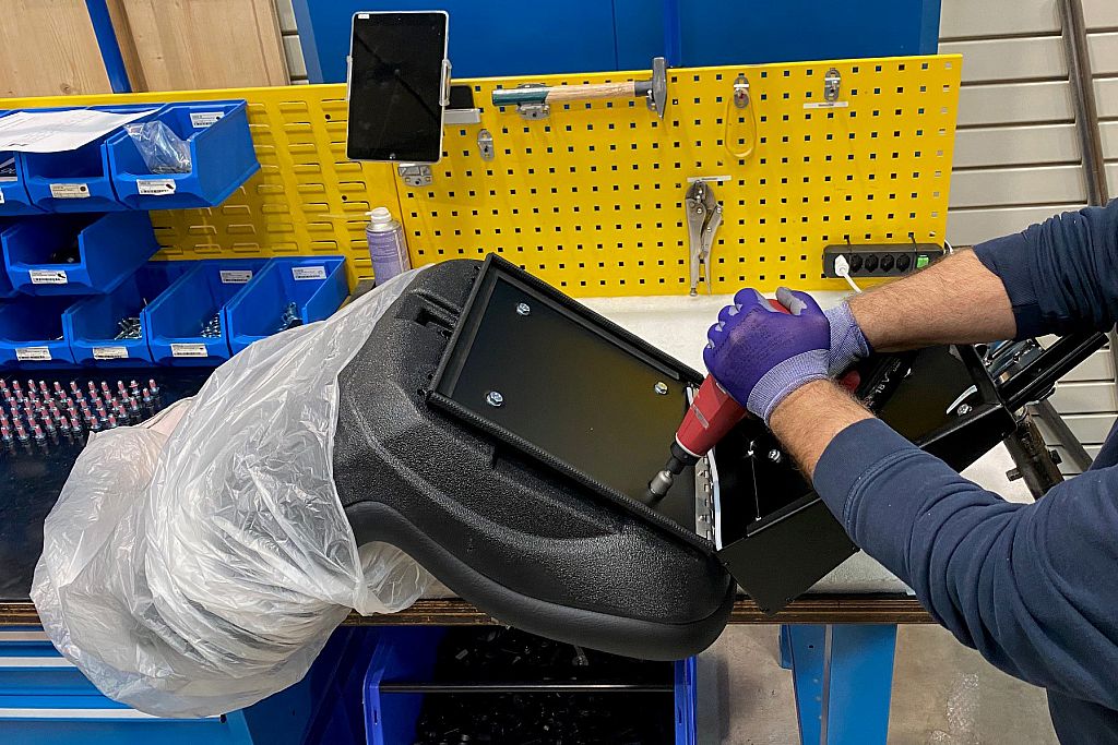Seit einigen Jahren ist das KYBURZ-Logo im Sitz eingeprägt und der Sitzschalter ist vom Hersteller schon eingebaut. Die Verbindung des Sitzschalter-Kabels und die Montage der Sitzkiste mit vier Schrauben machen die Mitarbeitenden der Vormontage.