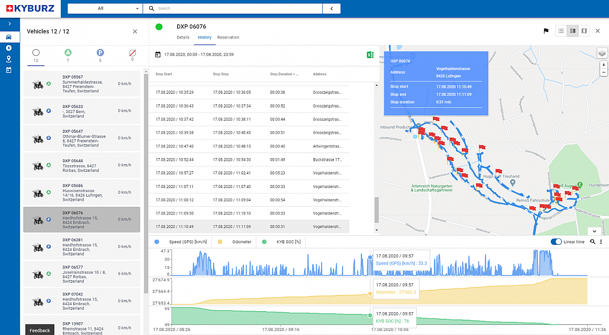 Das Diagnosetool von KYBURZ Fleet ermöglicht die detaillierte Analyse von Fahrten und Fahrzeugparametern. Alle durch die Fleet-Box erfassten Grössen wie z.B. Geschwindigkeit, Energieverbrauch, Stromstärke, Batterieladestand, Batterie und Motorentemperatur oder Fehlercodes können synchron auf der Karte, als Liniengrafik und tabellarisch dargestellt werden. Fehlerbilder, die direkt am Fahrzeug nicht erkennbar sind, können in der Liniengrafik als typisches Muster sofort identifiziert werden.
